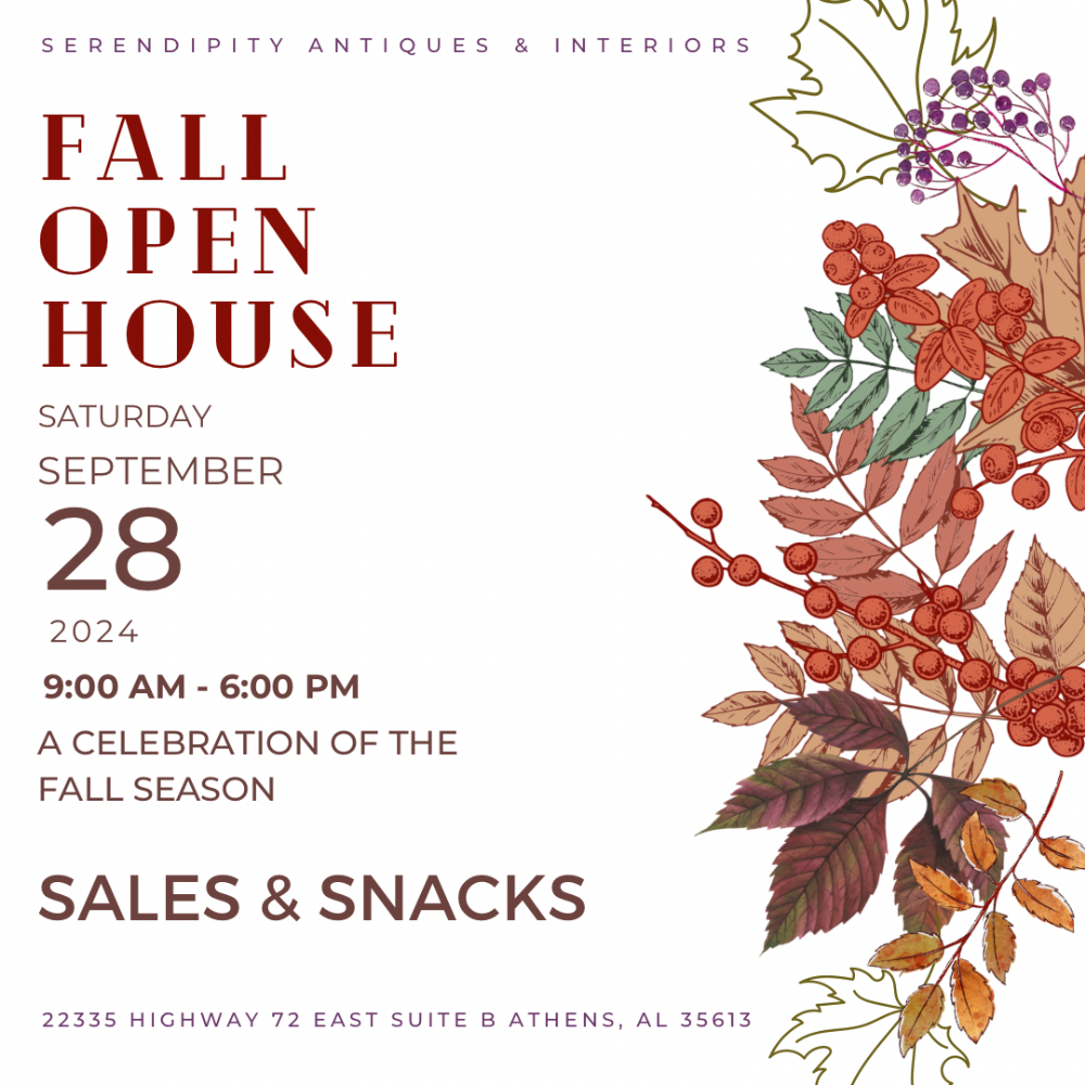 Website https://facebook.com/events/s/fall-open-house/1083224542938330/? Location Serendipity Antiques & Interiors 22335 US Highway 72 East Ste B Athens, AL 35613 Get Directions using Google Maps791648CD-7173-45A9-8B35-75A772453044